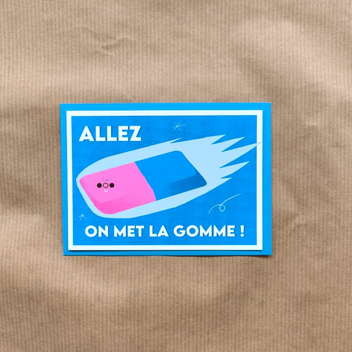 La mini-carte « On met la gomme » (format complice et papier 300 g/m²) est une jolie façon de dire “on efface le passé et on avance.” Imaginée par Marion Demeulenaere, (illustratrice de Bruxelles te salue Fieu), elle combine humour et douceur pour encourager vos proches ou accompagner vos petites attentions. Vendue avec une enveloppe, elle est idéale pour envoyer un mot motivant ou un clin d’œil réconfortant.