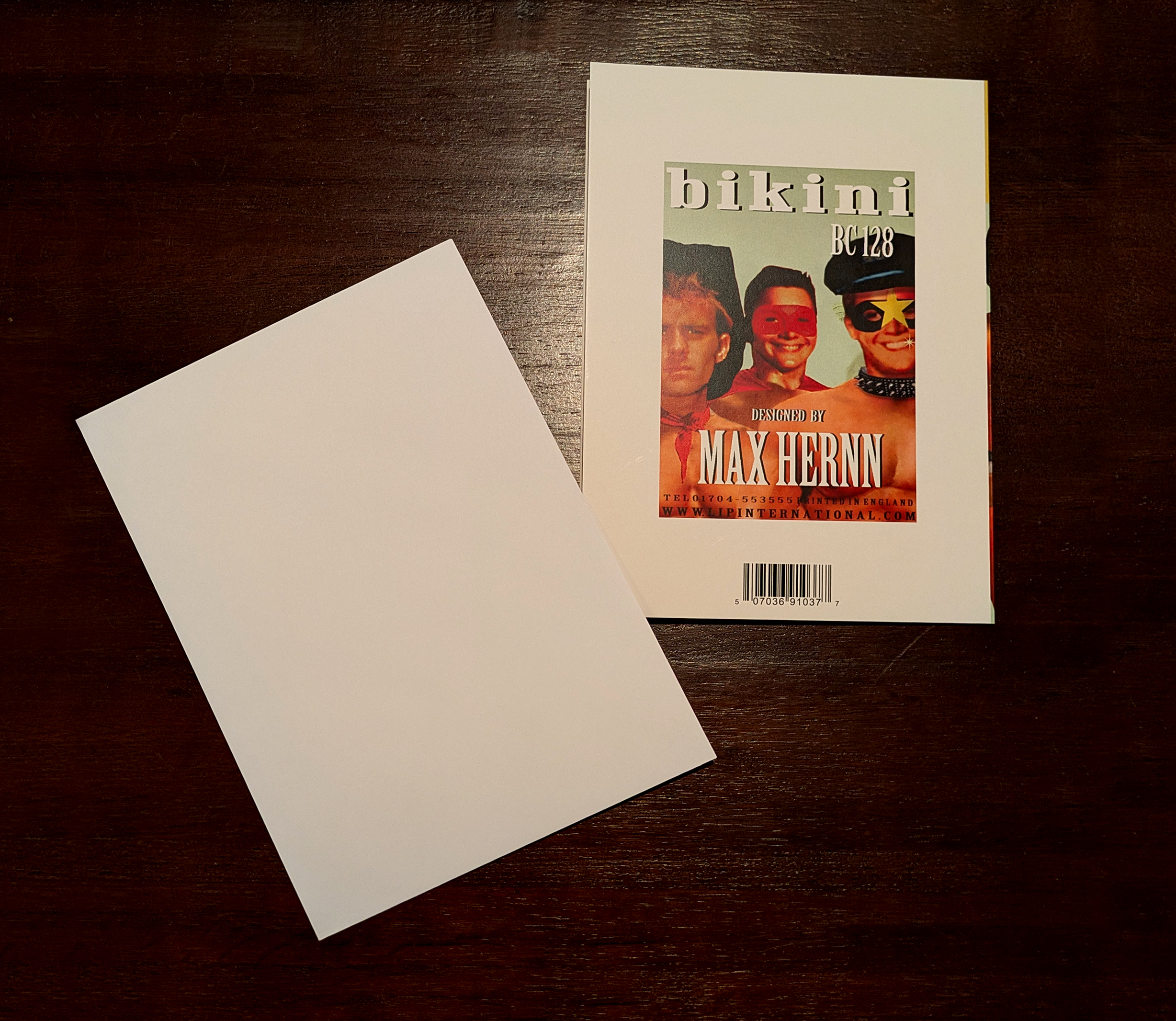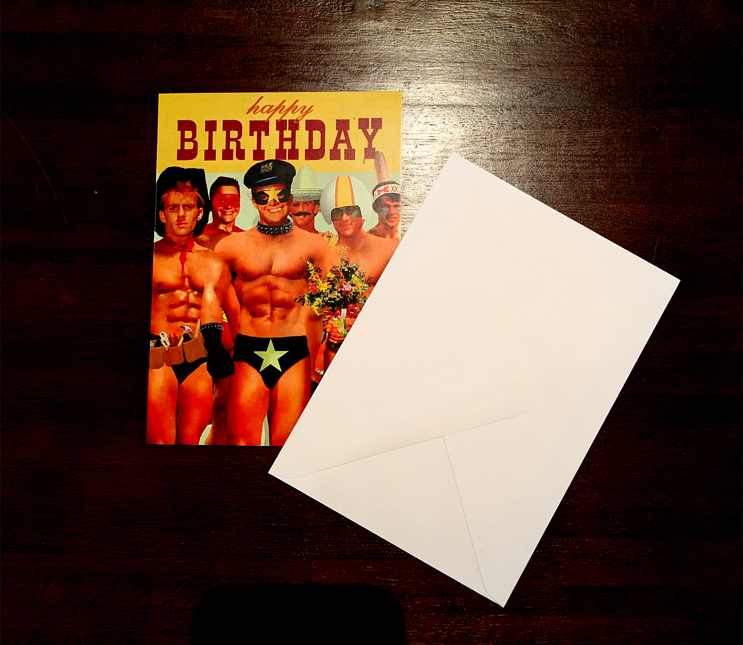 Carte à rabat, illustrée par Max Hernn, avec son enveloppe blanche et des hommes musclés qui souhaitent un Happy Birthday.