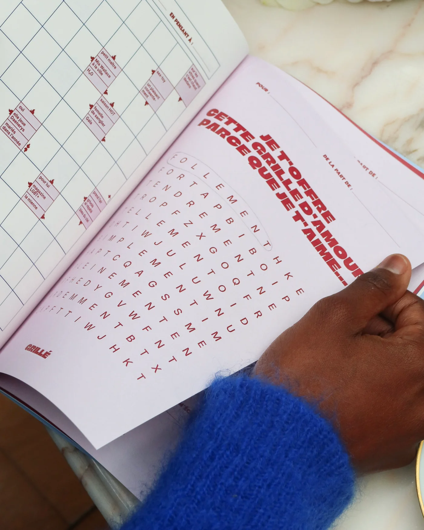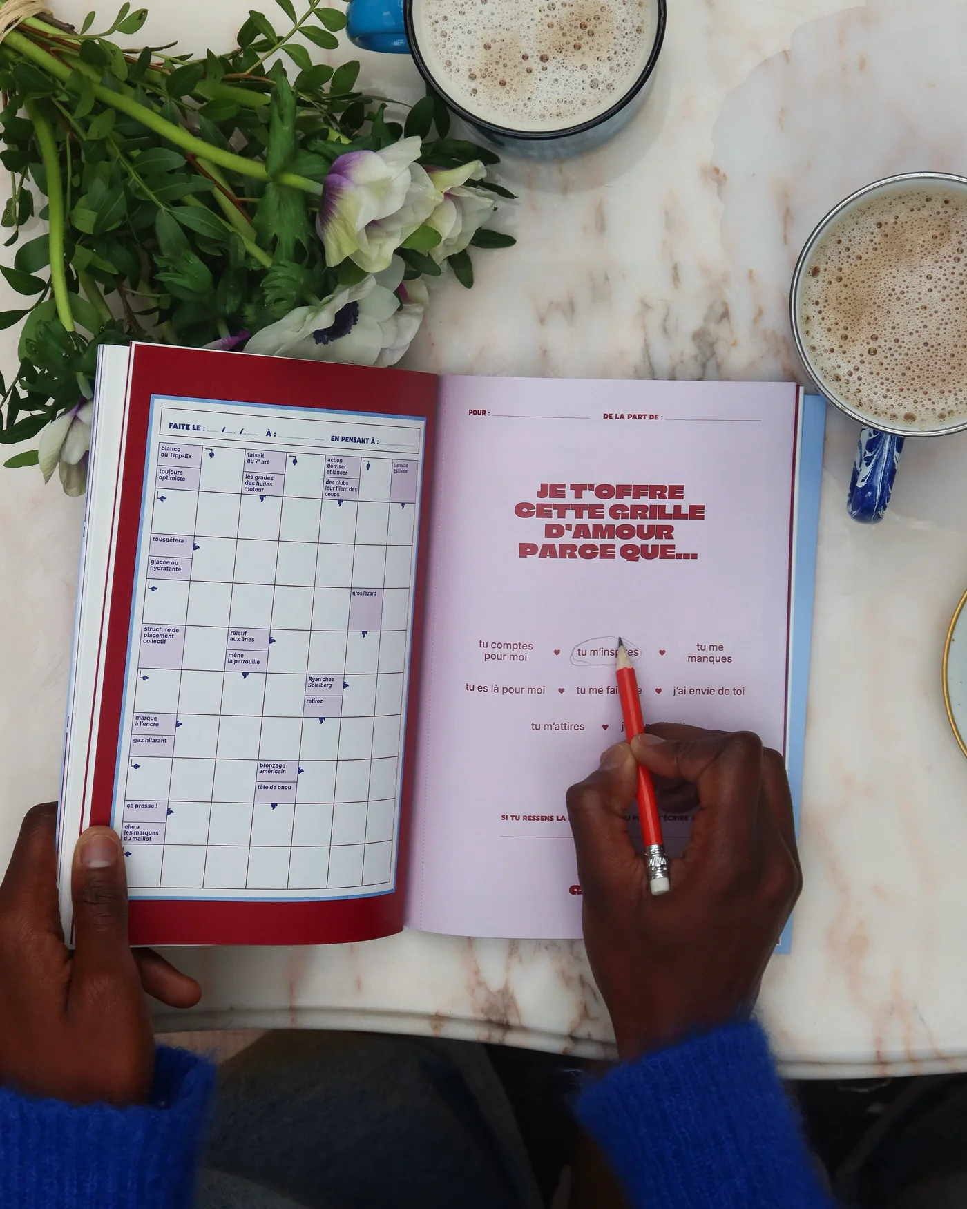 Cahier de mots fléchés thème amour, avec ses 30 grilles dédiées aux sentiments : du coup de foudre aux Love Stories. Ces grilles revisitent les classiques avec humour, culture pop et poésie.
