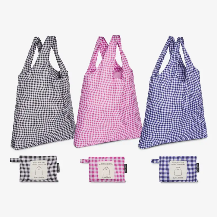 Le sac pliable imperméable à imprimé “Vichy” de Clima Bisetti allie style et praticité pour accompagner toutes vos activités du quotidien.